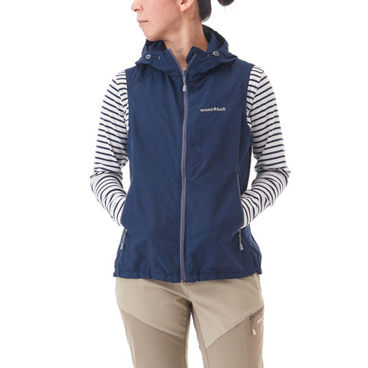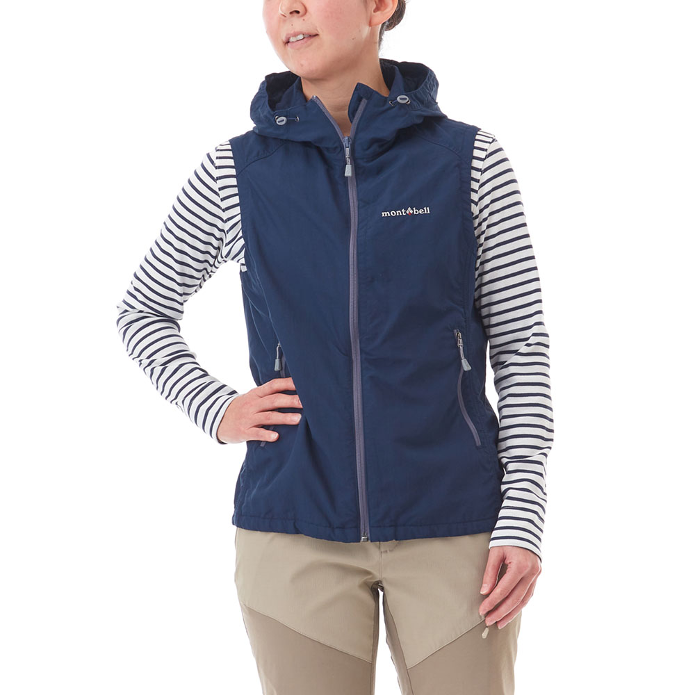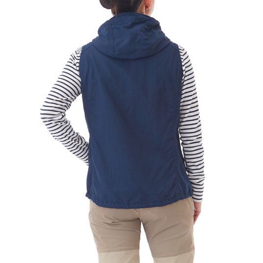 コットンのような柔らかさと肌触りを持つ薄手のナイロン生地を使用した、軽くてシンプルな防風ベストです。腰ポケット内のドローコードで、すそのフィット感を簡単に調節可能。紫外線や防寒対策としても活躍するフード付きです。