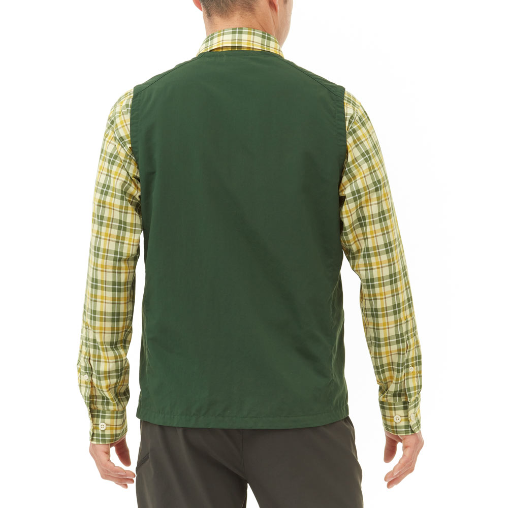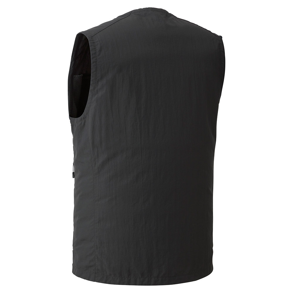 コットンのような柔らかさと肌触りを持つ薄手のナイロン生地を使用した、軽くてシンプルな防風ベストです。襟付きシャツなどと合わせて着やすいVネックタイプです。
