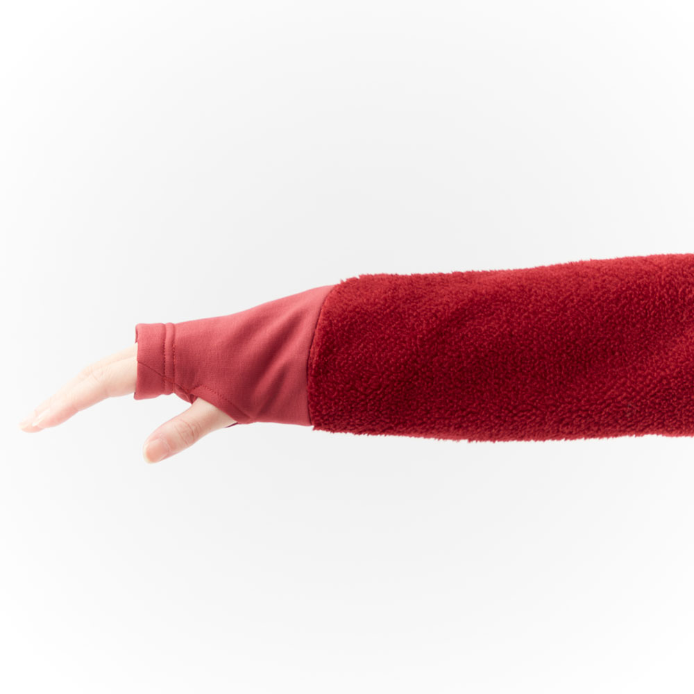 毛足の長いポリエステル繊維を編み込んだフリース素材です。多くの空気を蓄えることができるため、高い保温性を備えています。