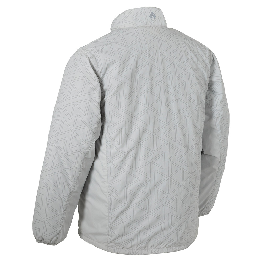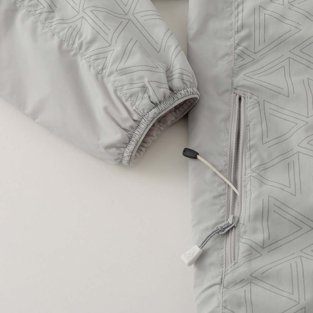 車のライトなどを反射して光る特殊プリント(リフレック)を全面に施し夜間の視認性を高め、安全性を確保するウインドブレーカーです。防風性とはっ水性を備えた滑りの良い表地に、暖かく蒸れにくい起毛メッシュの裏地を組み合わせているので、秋口や春先など肌寒いときに着用するのに適しています。付属のスタッフバッグにコンパクトに収納して持ち運べます。
