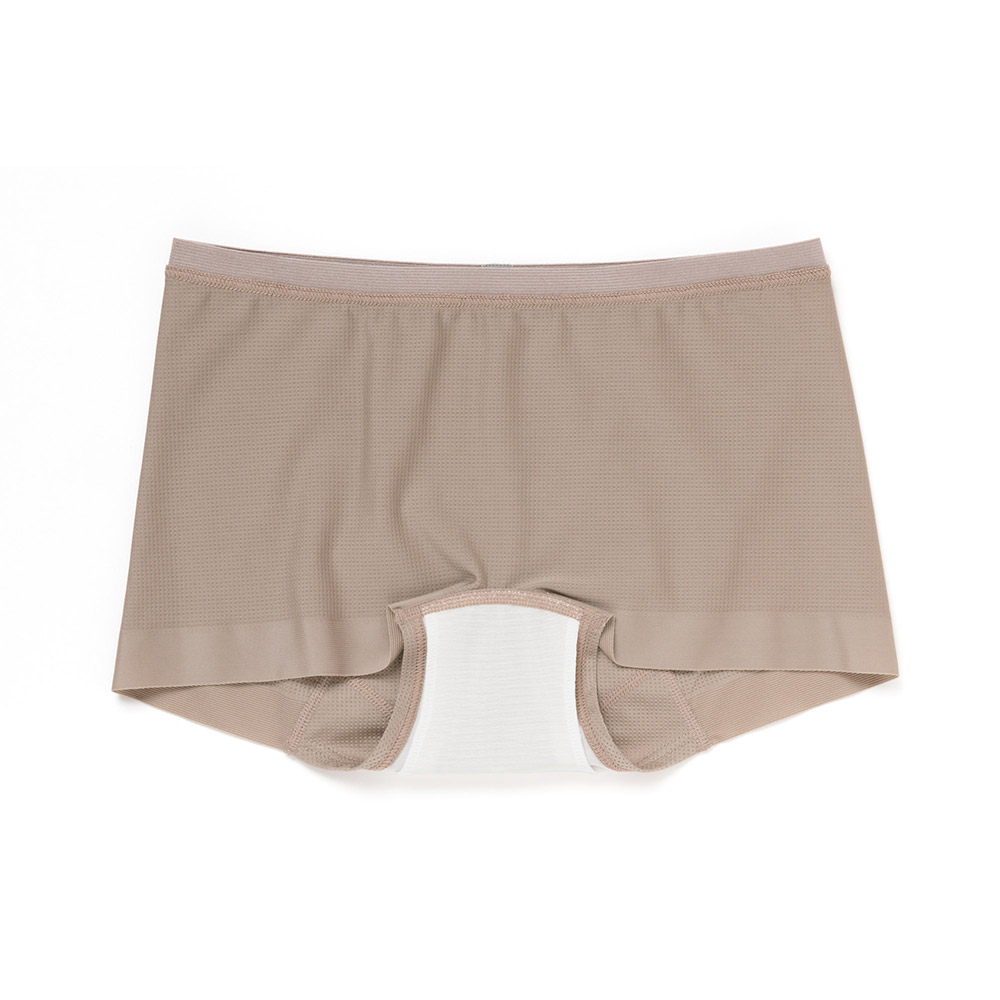 通気性に優れた高機能素材ジオライン®メッシュを使用した生理用ショーツです。クロッチ部分に防水性が高い生地を使用しています。表にラインがひびきにくくなっています。