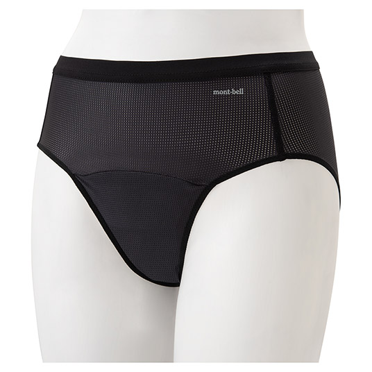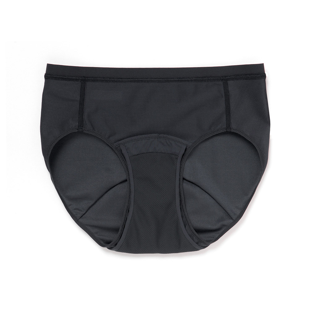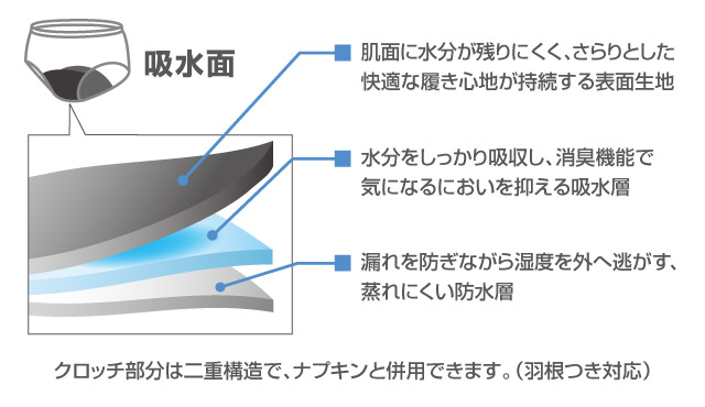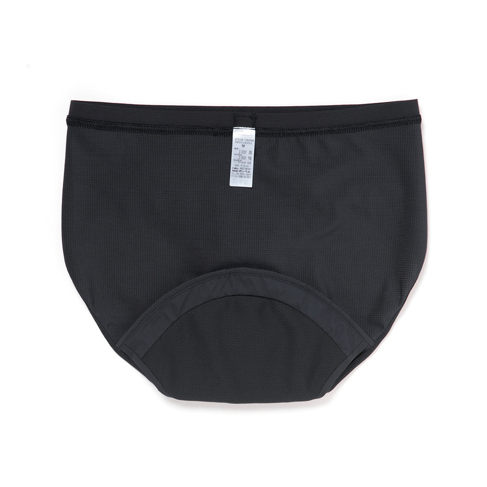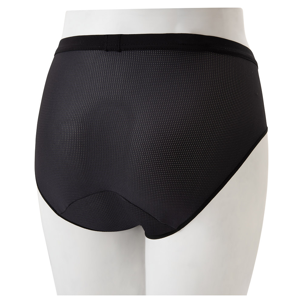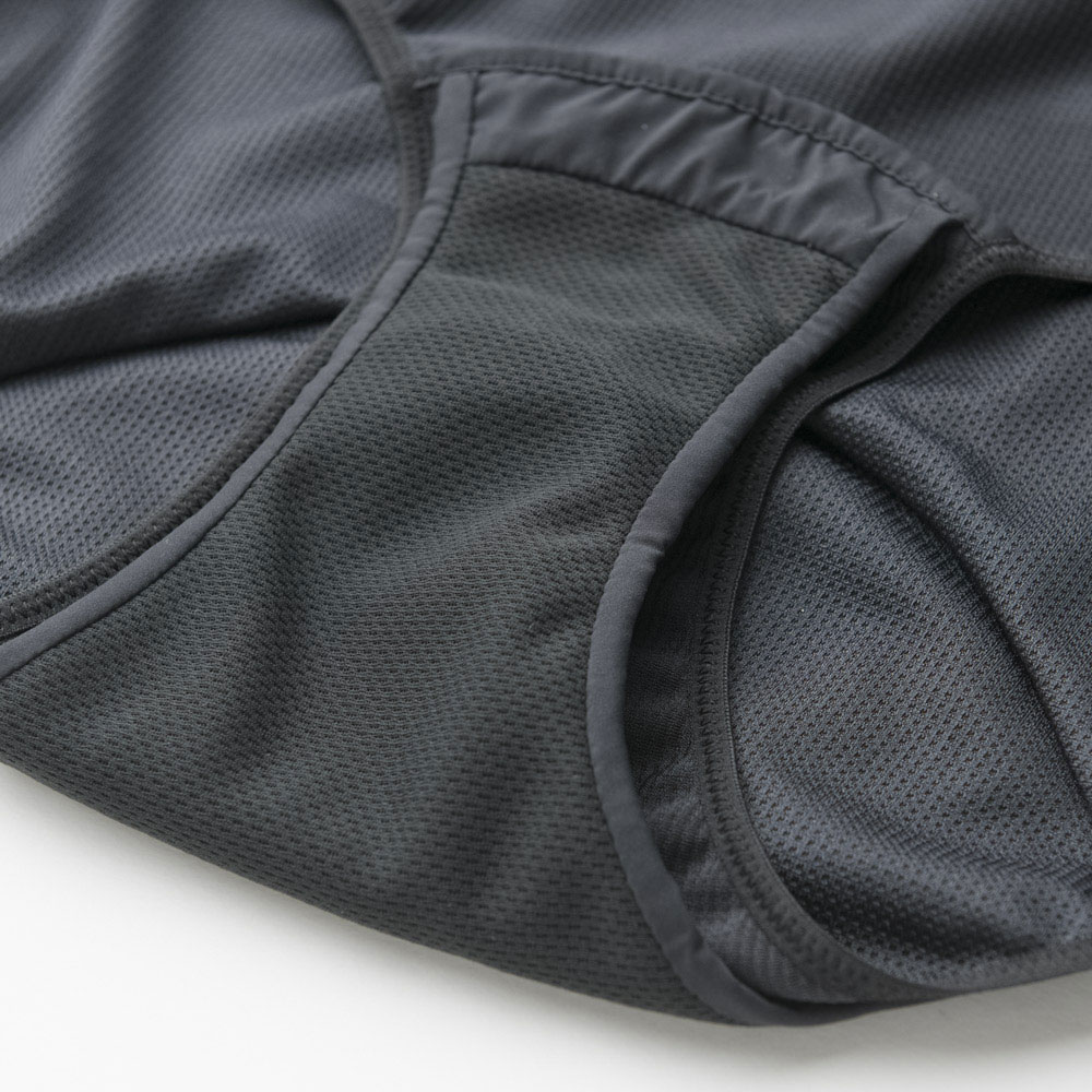 高機能素材ジオライン®メッシュを使用し、優れた通気性と速乾性を実現した吸水サニタリーショーツです。吸水部分は3層構造。肌面はドライに保ち、内側の生地は消臭機能を備え、吸水量は10~20cc程度です。外側は防水透湿性の生地で安心です。