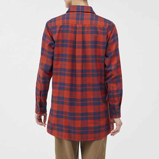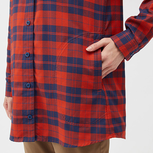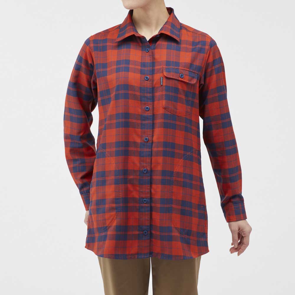 お尻がすっぽりと隠れる丈のトレッキングシャツです。柔らかな風合いで、適度な保温性を備えた中厚手のウイックロン®を使用しています。