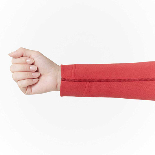 袖口の縫い目を斜め(スパイラル状)にすることでよく伸び、肌あたりの悪さや不快な締め付け感のない快適な着心地を実現しています。