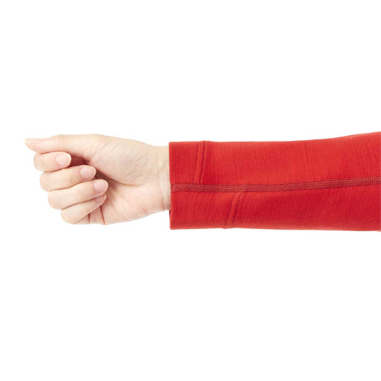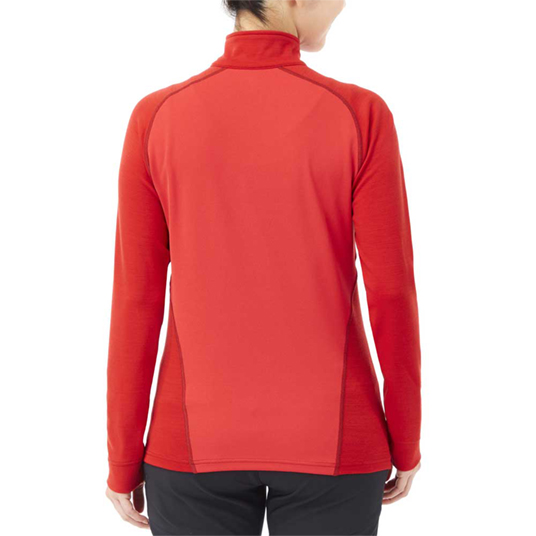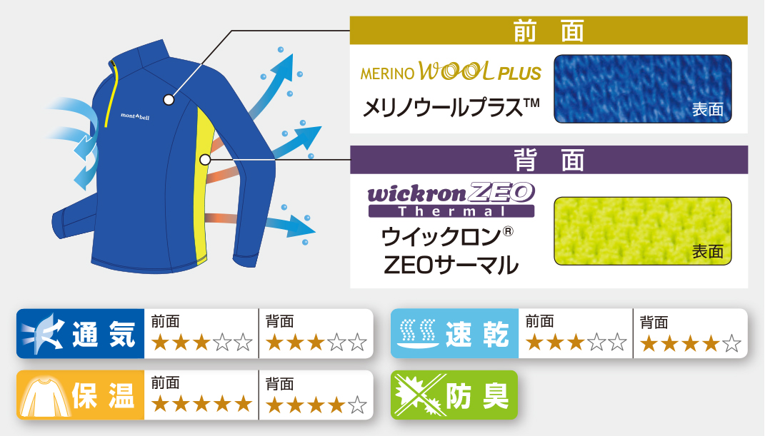 前面に抜群の保温性を備えたメリノウールプラス™、背面に吸水拡散性に優れ、蒸れを効果的に外に逃がすウイックロン®ZEOサーマルを使用。秋冬はインナーとして、春は1枚で行動着として、一年を通じて活躍します。ご家庭で簡単に洗濯できます。
