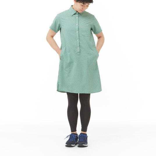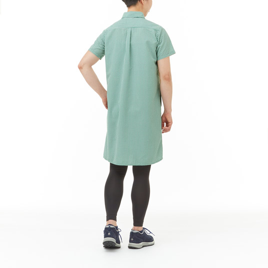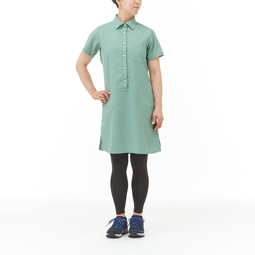 生地表面に独特の凹凸を持つサッカー地を使用し、タイツとのコーディネートに最適なシャツワンピースです。生地と肌が点で接するため肌離れがよく、常に爽やかで涼しい着心地が持続。また、速乾性に優れ、シワになりにくく型くずれもしにくいため、長期の旅行にもおすすめです。