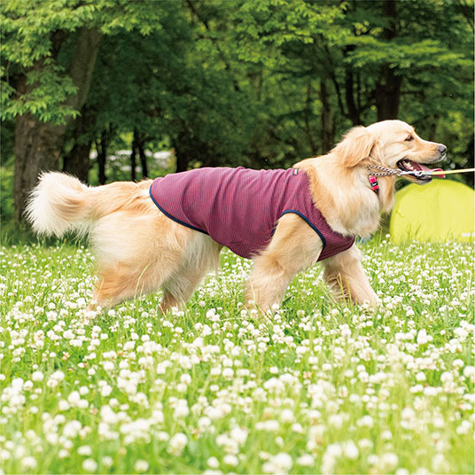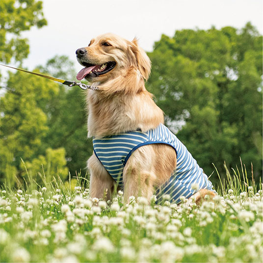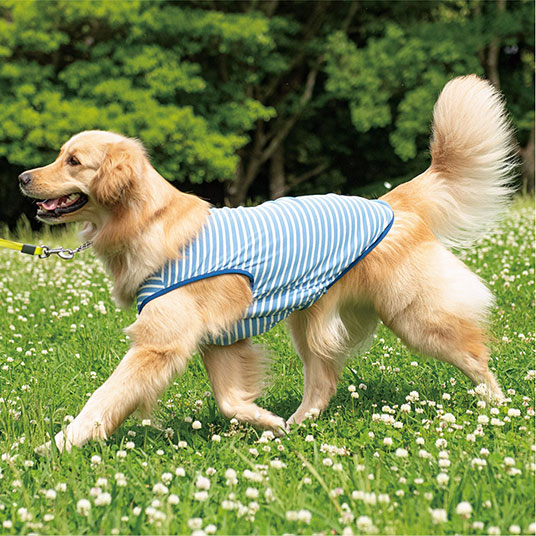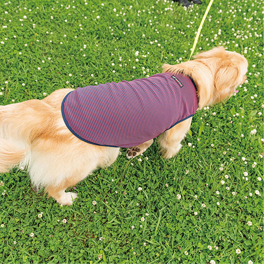 人用Tシャツでも使用されている、速乾性と通気性に優れる快適素材ウイックロン®を使用した犬用Tシャツです。リブ編みにすることで、よく伸びて着せやすく、汚れ防止や抜け毛の抑制にもなります。