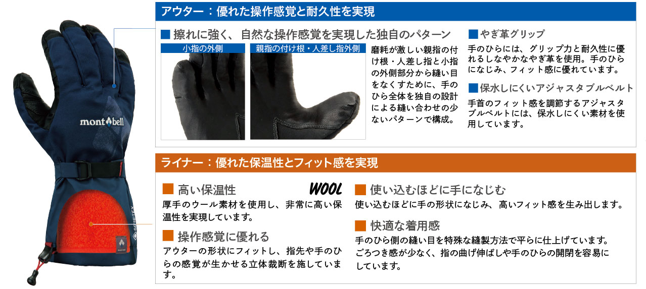 【特長】(アウター)ライナー着脱式/縫い合わせの少ない手のひらパターン/ラップアラウンドフィンガー/アジャスタブルベルト/ワンハンドアジャスター/グローブリーシュ用ループ/左右をつなぐバックル