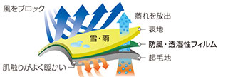防風・透湿性に優れるフィルムを、ストレッチ性を持つシェル素材と暖かなフリース地で挟み込んだ素材です。激しい動きにも追従するためウインタースポーツに最適。表地にははっ水加工を施しています。