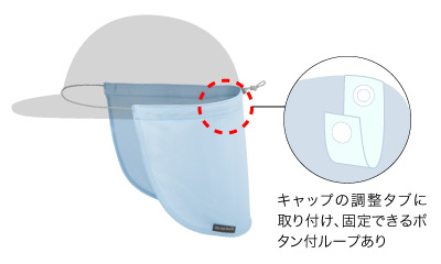 キャップやひさしの短いハットに装着可能な日除け布です。通気性とUVカット効果を両立した素材を使用し、首筋への日差しを効果的に遮ります。