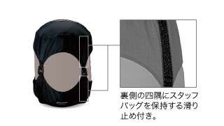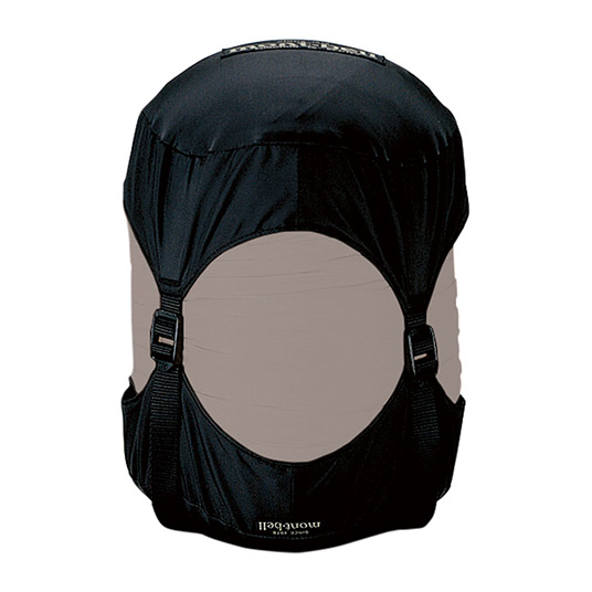 コンパクトなモンベルのスリーピングバッグをさらに圧縮し、少ないスペースでバックパックなどに収納するための便利なアイテムです。圧縮の際にしっかりとスタッフバッグを保持するよう、内側に滑り止めをつけています。