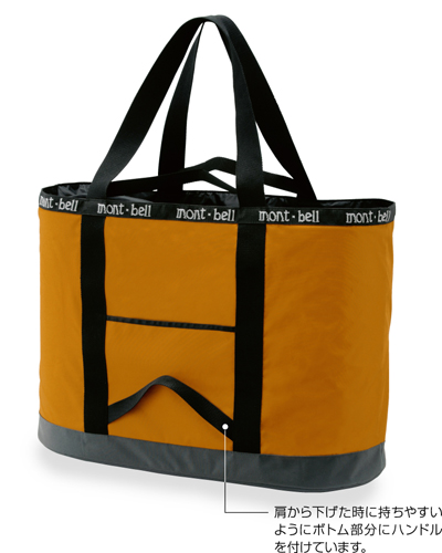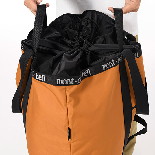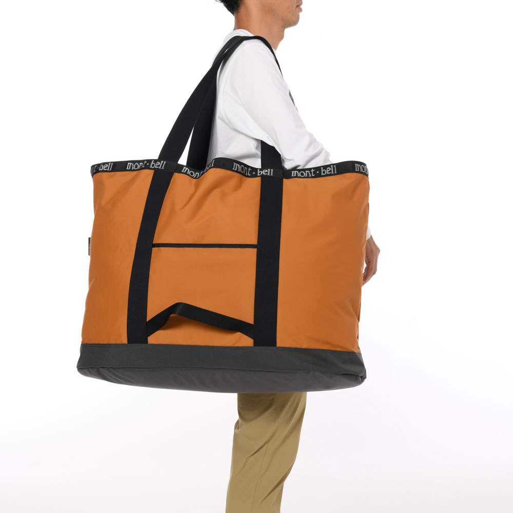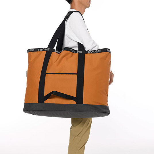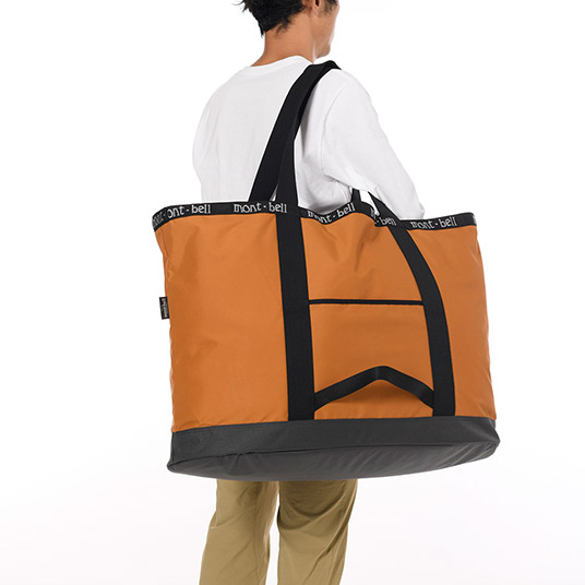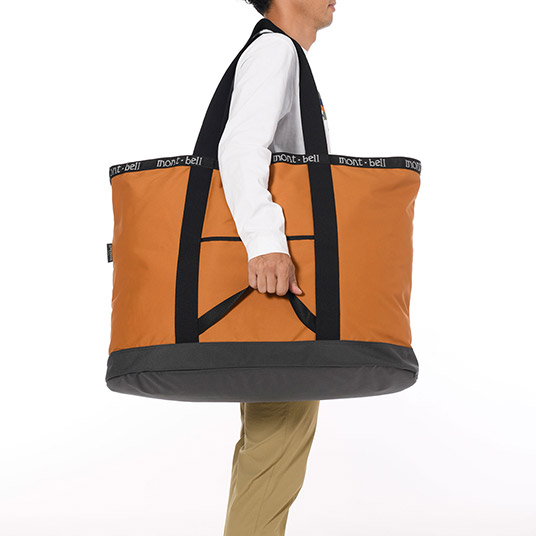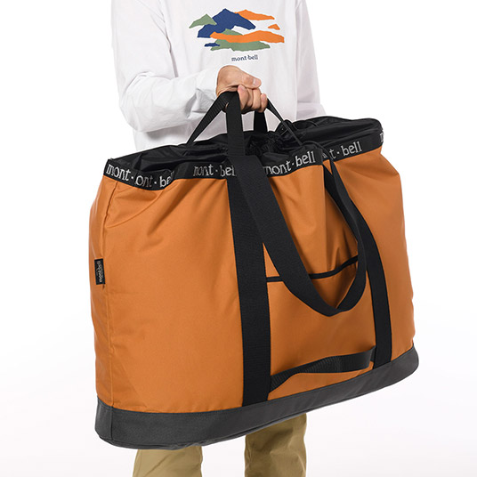 しなやかで丈夫な生地を使用した大型トートバッグです。開口部には、荷物の飛び出しを防ぎ、ホコリや雨などを入りにくくするためのフラップを設け、底部には10mm厚のクッション材を封入。ショルダーベルトと手持ち用ハンドル付きで、肩掛けの際には、ボトム部分に備えたハンドルを持つことで肩への負担を軽減できます。大量のギア類やキャンプ用品をまとめて持ち運ぶのに便利です。