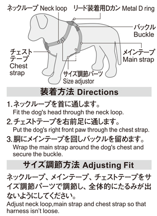 ○犬以外に使用しないでください。 ○対応サイズはあくまで目安です。犬種によって引く力や気性が異なります。飼い主の責任において犬種に合った製品をお選びください。 ○どのような犬用品でも、犬の体型や動きなど、様々な条件によりハーネスが外れたり抜けたりする場合があります。飼い主の責任において充分な安全管理を行ってください。 ○係留に使わないでください(事故などの防止)。 ○幼犬時期など成長が活発な時期は、本製品が適格なものか常に確認してください。 ○ハーネスやカラーのバックル、リードのナスカンは確実に取り付けてあるか常に確認してください。 ○犬用品は消耗品ですので、散歩や手入れの際に必ず点検し、摩耗や破損がある場合は、早めに取り替えてください。