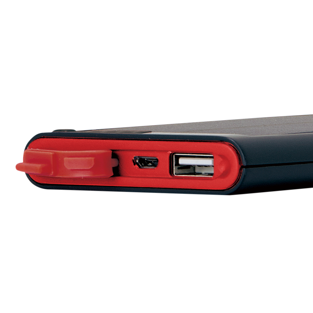 フィールドや外出先、緊急時などに便利な予備バッテリーです。4000mAhの電池容量を持ち、スマートフォンなどのモバイル機器への充電が可能です。本体への充電はパソコンなどのUSB端子から可能で、前面のソーラーパネルからも補助的に行えます。本体の電池容量が分かるインジケーター付きです。