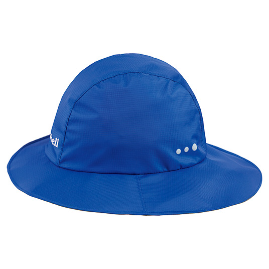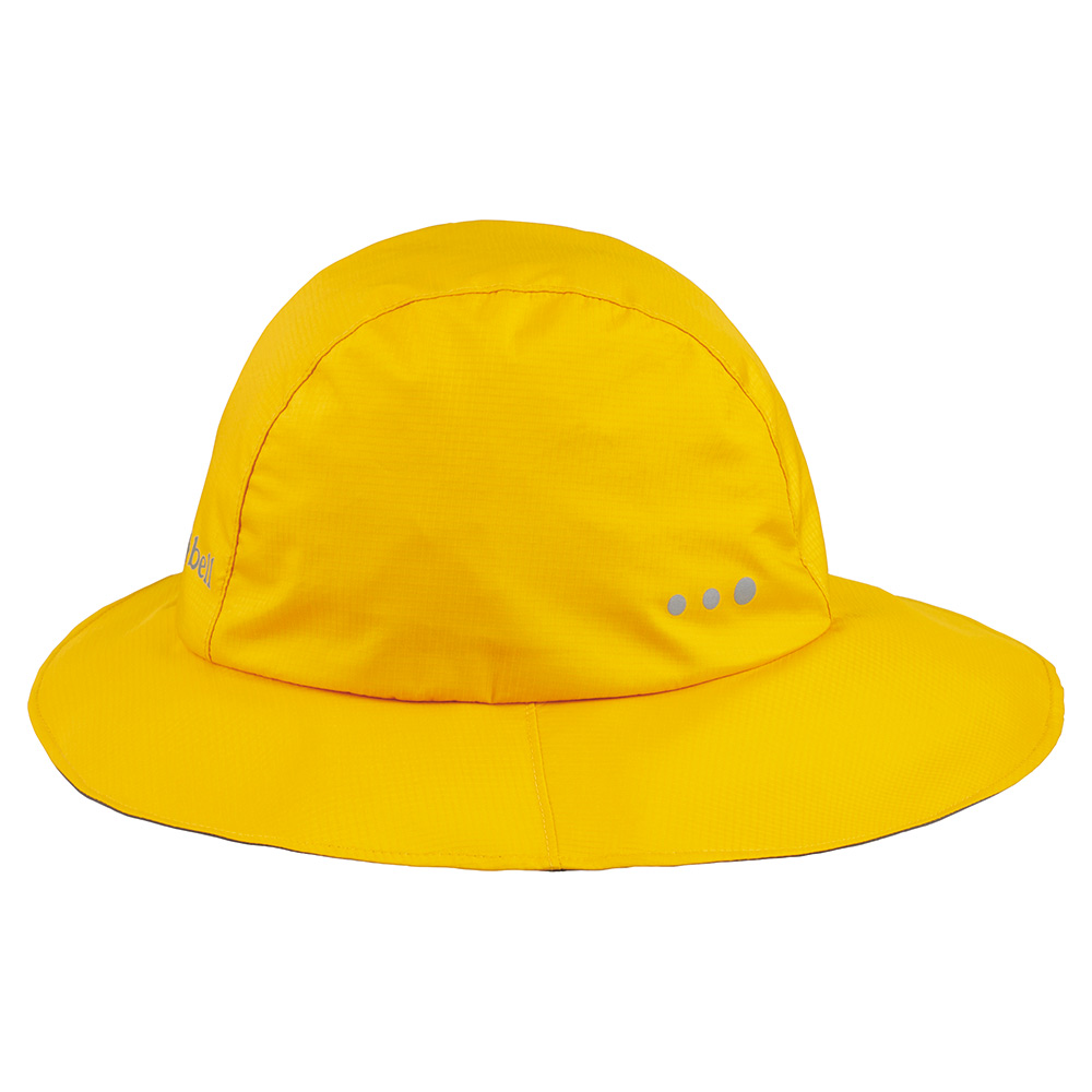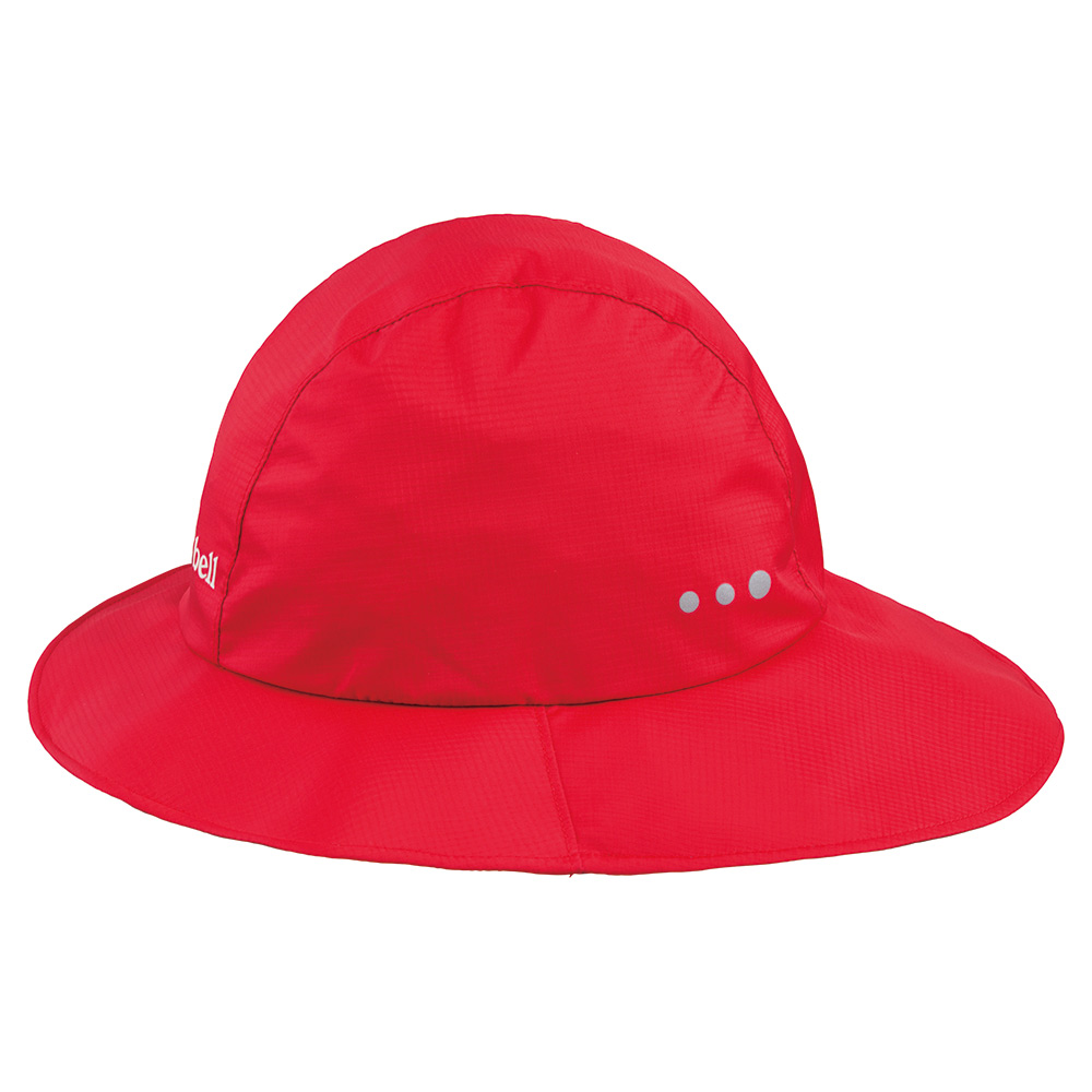 レインウエアのフードをかぶるのが苦手なお子さまにおすすめの、防滴性と透湿性を備えたハットです。ツバ後部をやや長めに設定したデザインで、襟首への不快な雨だれも防ぎます。夜間の安全性を高める反射マーク付き。※縫い目には防水処理を施していません。