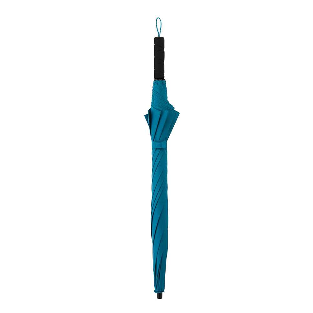 開閉しやすく、折りたたまずに使用する軽量でシンプルな長傘です。収納時に、バックパックのサイドポケットなどに取り付けられるサイズです。トレッキングポールのような形状の握りやすい持ち手。