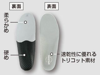 前方を柔らかめ、後方を硬めにして着地から蹴り出しまでの一連の動作をサポート。表面には速乾性に優れた素材を採用しています。