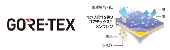 1平方センチメートルに約14億個もの微細な孔(0.2ミクロン)を持つ、世界最高水準の防水透湿性素材です。「ゴアテックス ファブリクス3レイヤー」は表裏両面に生地を貼り合わせた3層構造素材です。
