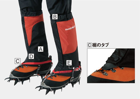 アイゼンやスノーシューで破れやすい足内側の広範囲を高強度エッジガードでカバーした、膝下丈の軽量モデルです。着脱が容易なベルクロ留め仕様。スタッフバッグ付き。