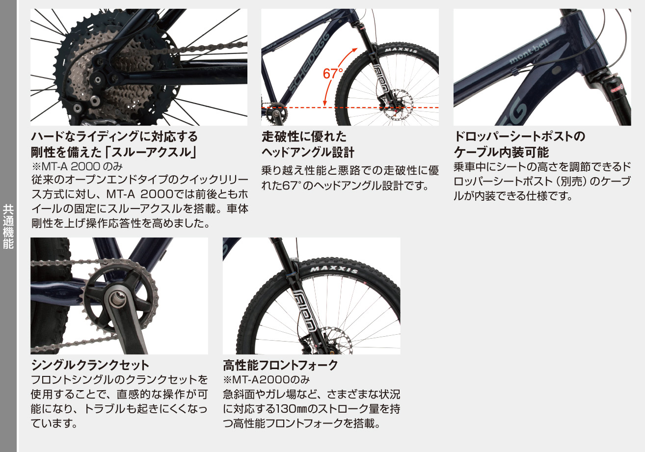 剛性に優れた異型断面ダウンチューブや、特徴的なヘッドアングル設計により、トレールライドにおける理想的な走破性を実現したマウンテンバイクです。MT-A 2000の走破性に優れたフレームはそのままに、コストパフォーマンスに優れたシマノ製コンポーネント「ALIVIO」を搭載。林道ツーリングからトレールライドまで楽しめるよう設計されたモデルです。