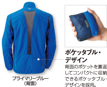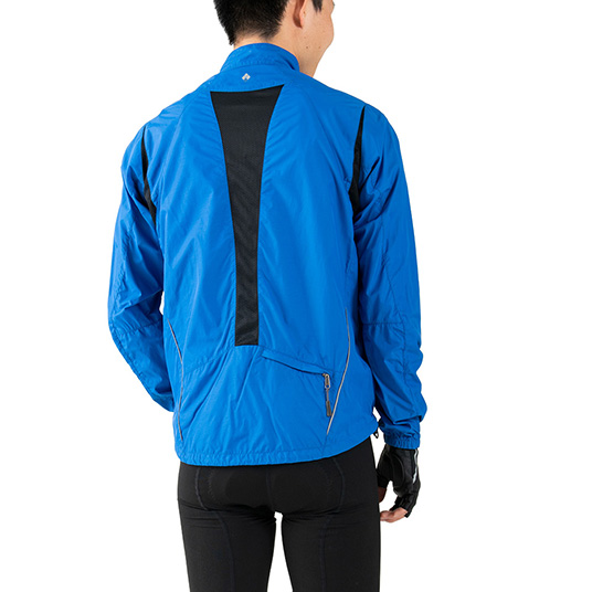コストパフォーマンスに優れた自転車専用ウインドブレーカーです。立体パターンの採用により、高速走行時のばたつきを抑え、脇部分と背面にはメッシュ地のベンチレーションを設けて、蒸れを素早く解消。表面には優れたはっ水性を誇るはっ水加工加工を施し、小雨程度なら難なくはじきます。本体は背面のポケットに収納可能なポケッタブル仕様です。