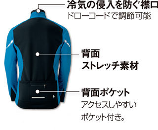 優れたストレッチ性を備え、抜群の運動性を実現したジャケットです。前身頃と袖部分に、ストレッチ性に優れた独自の防風シェル素材を採用することで、バタつきを大幅に軽減するタイトなシルエットと、運動性の両立を実現しました。裏地には適度な保温性を持つクリマプラス®メッシュ、後ろ身頃には抜群のストレッチ性と吸水拡散性を備える素材を使用しています。反射フィルムや背面ポケットなどを備え、一年を通して活躍します。
