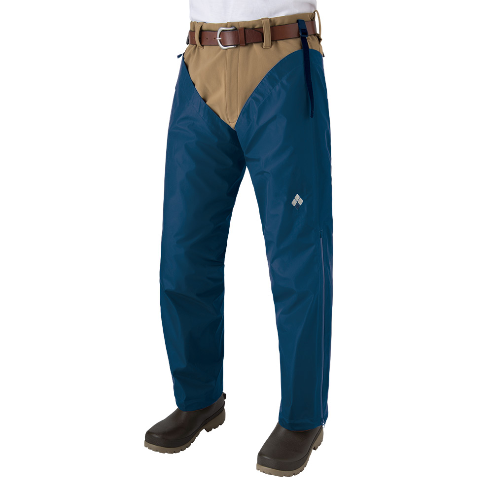 農業などの野外作業に適した機能性と耐久性を追求したレインチャップスです。防水透湿性と耐摩耗性に優れる独自の素材を使用。擦れやすい内股部分に縫い目を設けないデザインにすることで、摩耗強度を向上しています。上部のフックをパンツに引っ掛けて使用します。