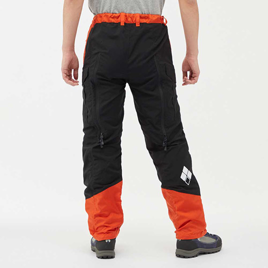 登山用パンツを元にパターンを設計し、膝には立体裁断を施し、背面にはストレッチ素材を使用している為、歩行時のつっぱり感なく、スムーズな屈伸運動や足上げが可能です。また、すっきりとしたシルエットで、はきやすく動きやすいのも特徴です。