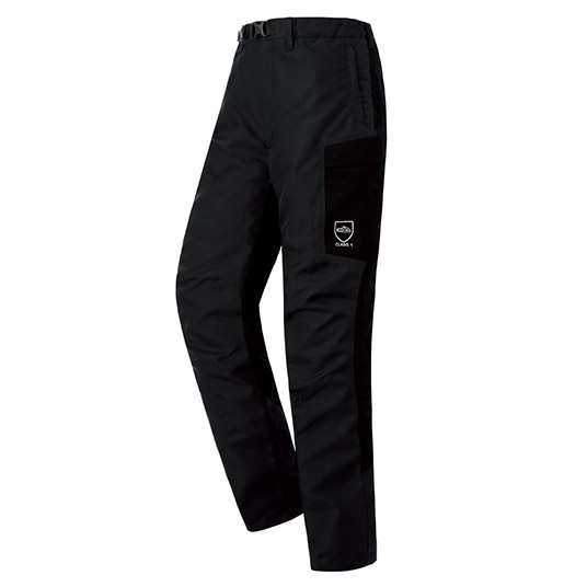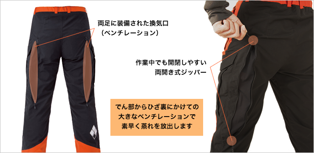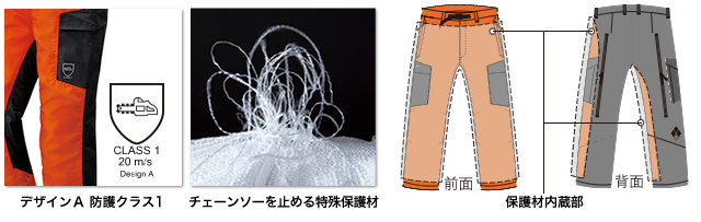 チェーンソーから体を守る特殊保護材を内蔵。チェーンソーの刃が特殊保護材に触れると、瞬時に繊維が引き出され、刃に絡み付く事で回転をストップさせます。
