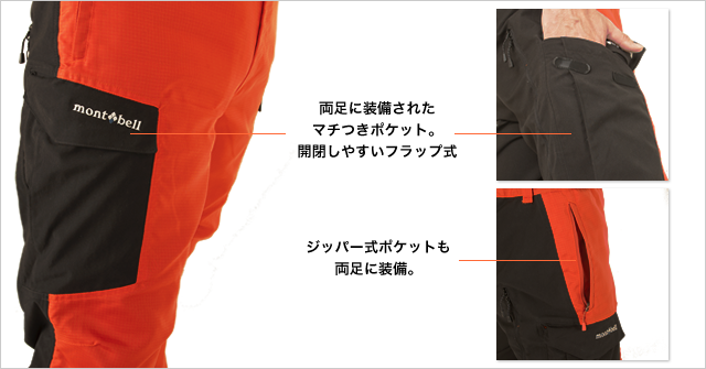 両足の脇に小物の収納に便利なマチつきポケットを装備しています(ジッパー式ポケットも両足に装備)。