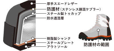 ステンレスワイヤー糸とケブラーからなる防護材をアッパーに封入することで、林業作業時などの安全面をサポートしています。