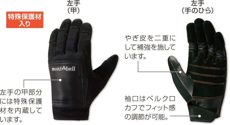 【特長】左手の甲側に防護材入り