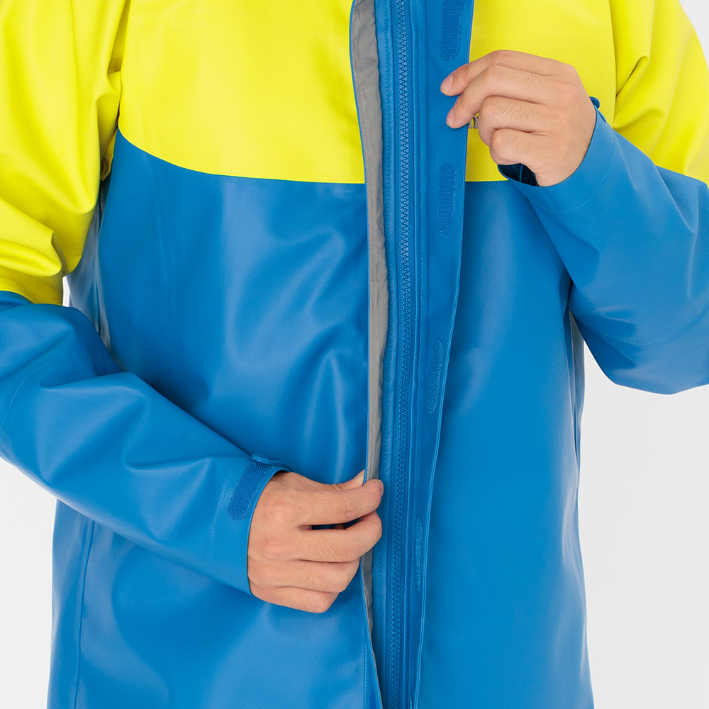 防水性に特化した一般的な漁業用ウエアに比べ、蒸れを放出する優れた透湿性と防水性を兼ね備えた汚れに強いウエアです。生地の表面に汚れにくい防護膜を備えた4層構造の防水透湿性素材ドライテック®生地を使用。ハードな使用にも対応可能な耐摩耗性を実現しています。長年のレインウエア開発で培われた、浸水を防ぐ独自の機能を備え、漁業の現場で高いパフォーマンスを発揮します。すっきりとしたシルエットながらも、厚手のインナーを重ね着することができます。