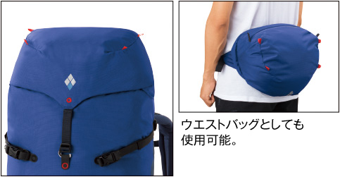 【機能】サイドストラップ 、ピッケルストラップ(樹脂) 、ワンドポケット 、ウエストベルトホルダー 、チェストサポート 、ポールループ、ロールアップシステム、トレールウォーターパック対応