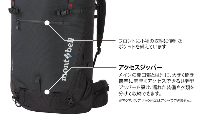 軽量かつ高強度な素材を使用し絶妙な重量バランスで大容量を感じさせない安定感のある背負い心地を実現したモデルです。フロントに小物の収納に便利なポケットと、荷室に素早くアクセスできるジッパーを備えています。別売の「トップリッドL」を装着することで、容量の拡張が可能です。