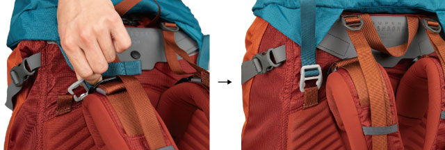 トップリッド後ろ側のフックを、バックパックのループに掛けます。