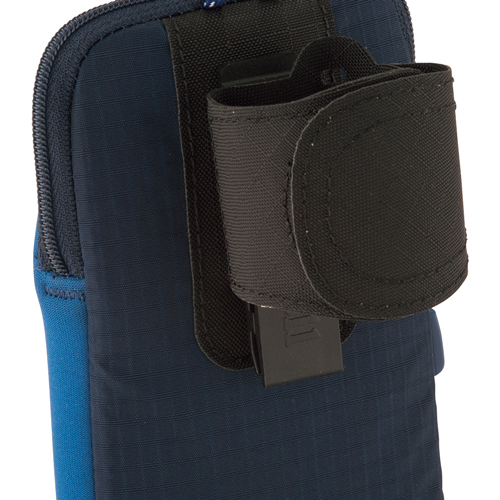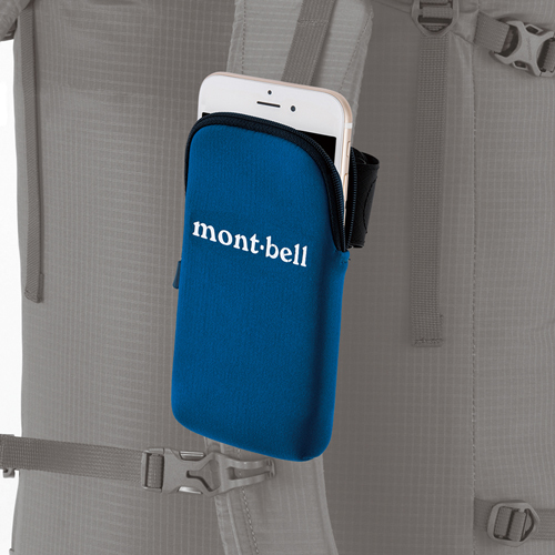 バックパックのショルダーハーネスに取り付けできるスマートフォンケースです。クッション性と伸縮性を備えた素材を使用し、本体のクリップでウエストベルトなどに取り付けることもできます。