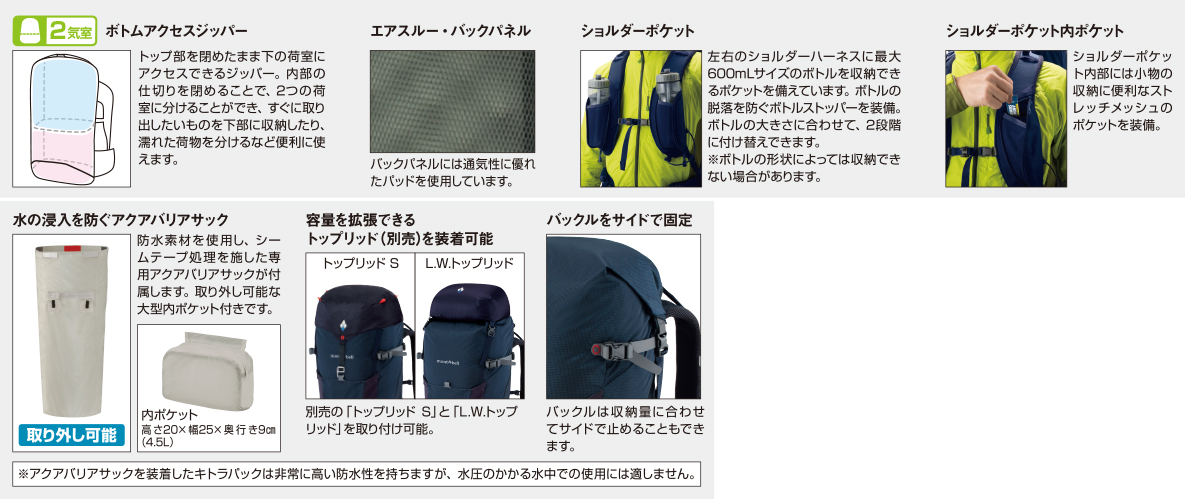 【機能】サイドストラップ/樹脂テープ/ワンドポケット/ヒップベルトポケット/ショルダーポケット(左右)/チェストサポート/ポールループ/ロールアップシステム/トレールウォーターパック対応