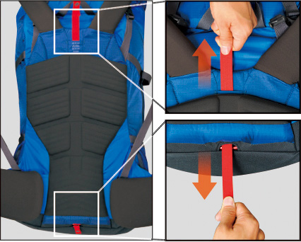 内側にソフト、外側にハードタイプのフォームを内蔵しています。脇・肩・背中へと包み込むように密着することでぶれを防ぎ荷重を分散。大容量を感じさせない絶妙な荷重バランスを実現しています。モデルによってスタビライザーテープでフィット感を調整できます。