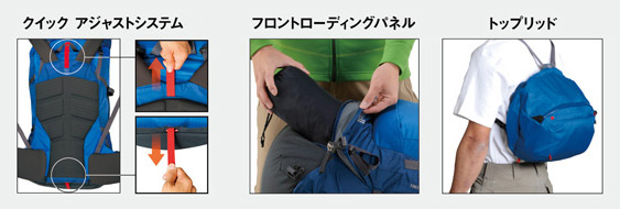 独自のフレーム構造に加えて、バックパネルに「クイックアジャストシステム」を搭載することで、素早いフィッテングと抜群の安定感を実現したモデルです。さらに、本体をしっかりと腰回りで支えるヒップベルトは肩への負担を軽減。体の動きに追従し足上げをしやすくすることで、快適な歩行をサポートします。アクアテクト®ジッパーを使用した大容量ポケットや取り外してアタックザックとしても単体利用できるトップリッドを備えるなど、機能性も充実。2、3泊程度のテント泊山行に適した容量です。女性にフィットするように設計されたモデルです。