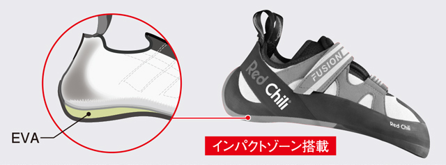軽量ながら、耐久性の高い緩衝材「EVA」をミッドソールのかかと下部分に挿入。岩場の移動とボルダーのランディングの衝撃を緩和します。かかと後側には挿入されていないので、ヒールフックには影響しません。