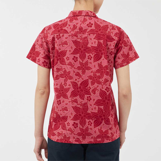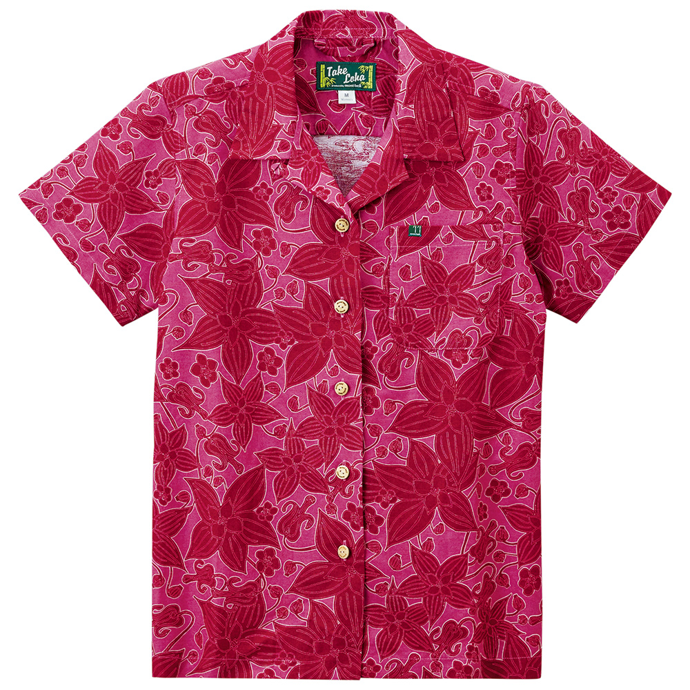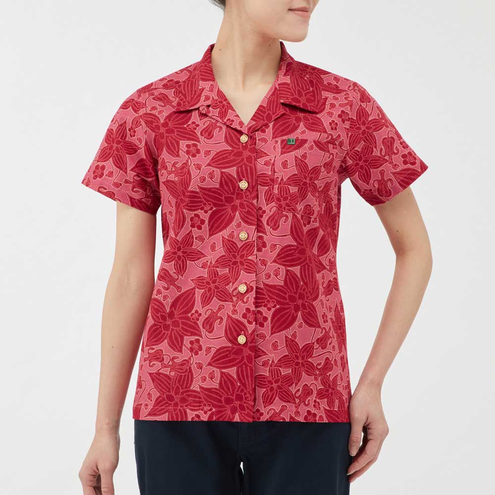 サラサラとした風合いで肌離れがよく、爽快な着心地のアロハシャツです。適度なハリを持つためシワになりにくく、トラベルシーンに最適。ナチュラルな表情で手触りもよい竹製ボタンを使用しています。高山植物ゴゼンタチバナをあしらったデザインです。