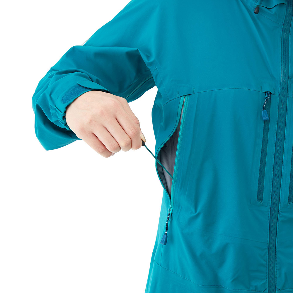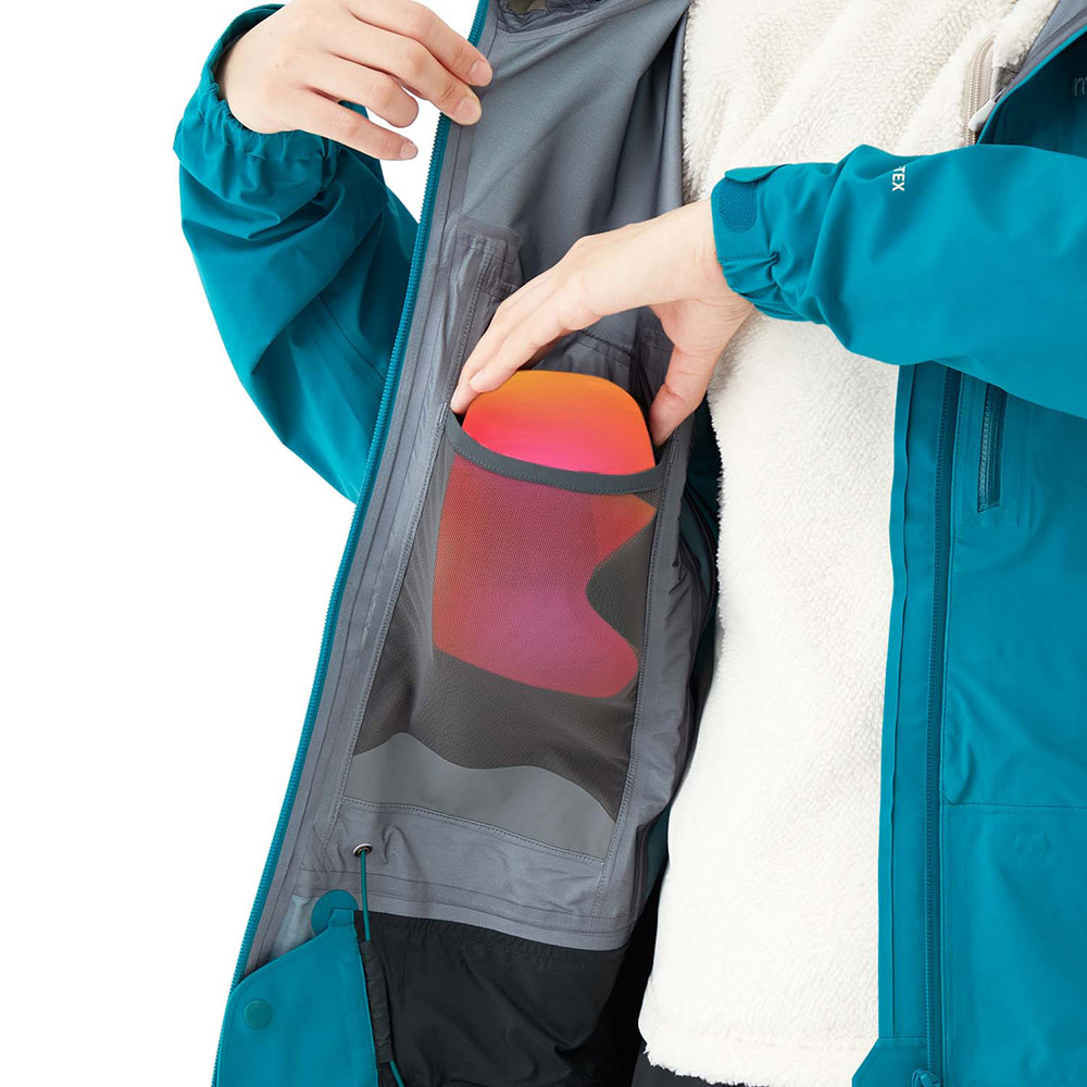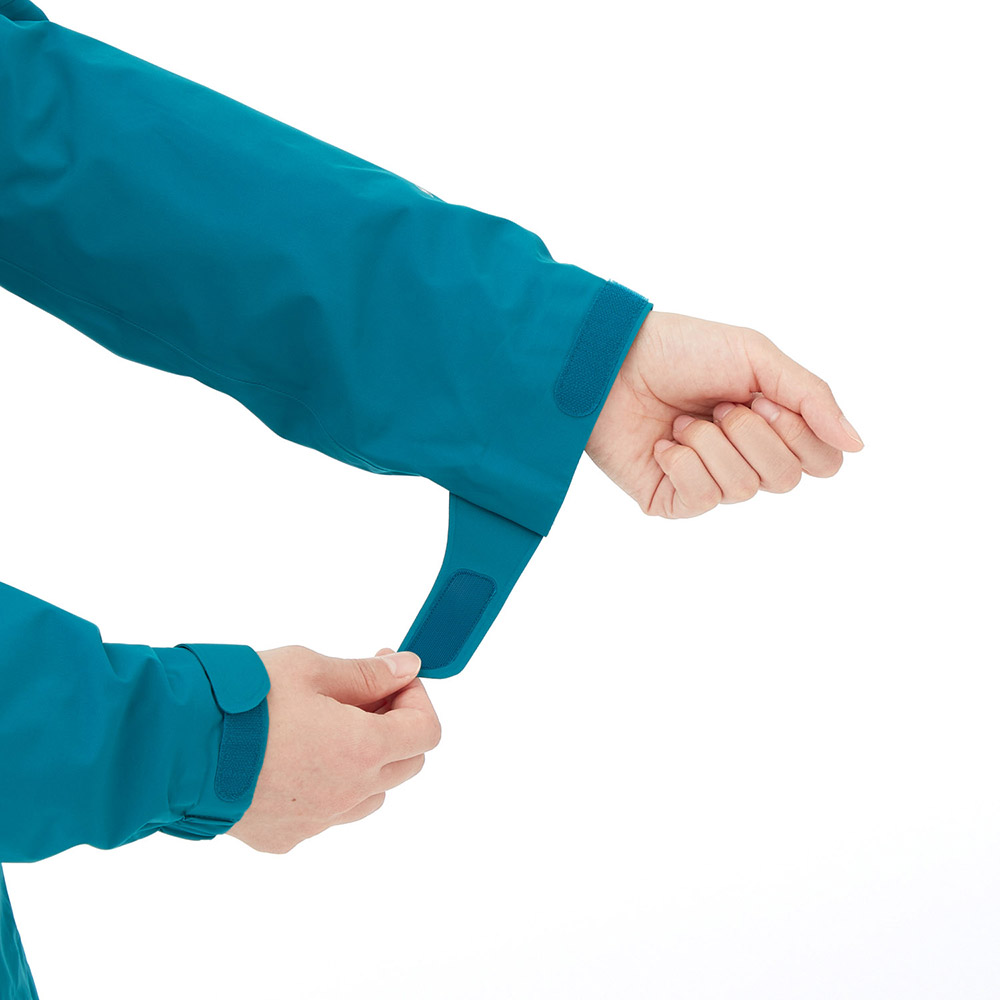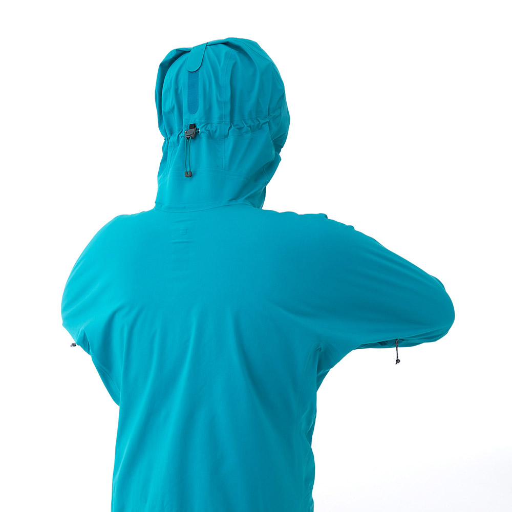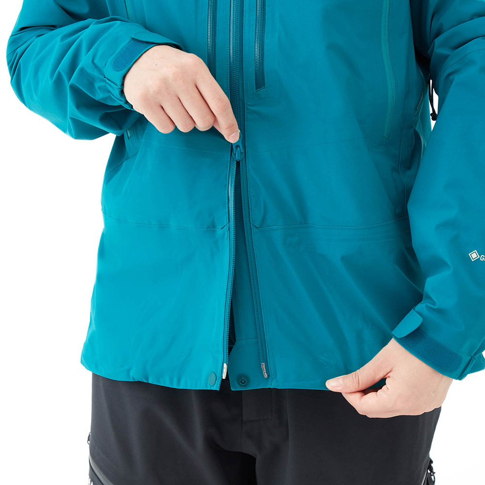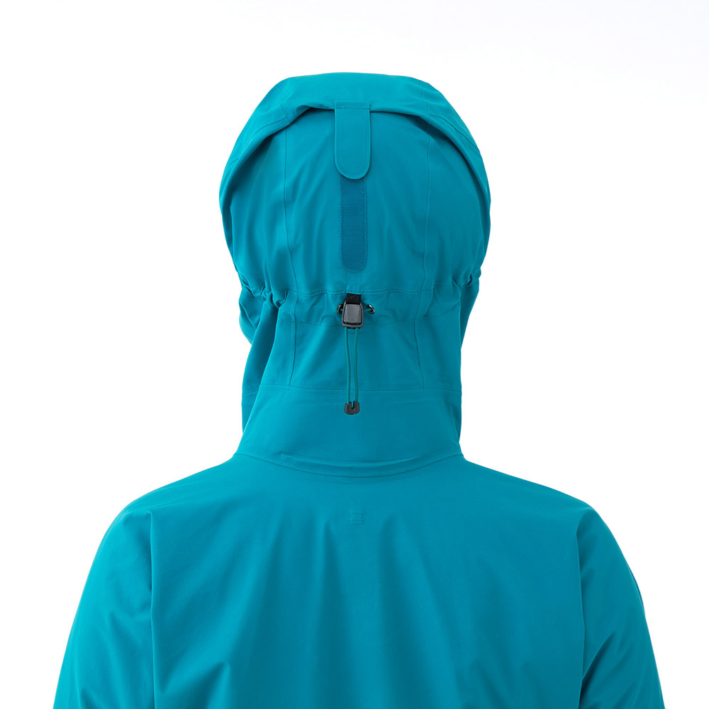 【特長】トライアクスルフード / フィット感を高める独自の立体パターン / 高めの襟元 / ジッパーが顔に当たらない仕様 / エアレーションシステム / 立体裁断(肘) / アルパインカフ / スムースピットジップ / アクアテクト®ジッパー / ダブルスライダージッパー / ウインドスカート / リードインコード・システム(ウィンドスカート) / 裾の調節は前身頃内側 / スタッフバッグ付き / 取り外しできる口元パーツ / 薄くて軽量な13mm幅のシームテープ