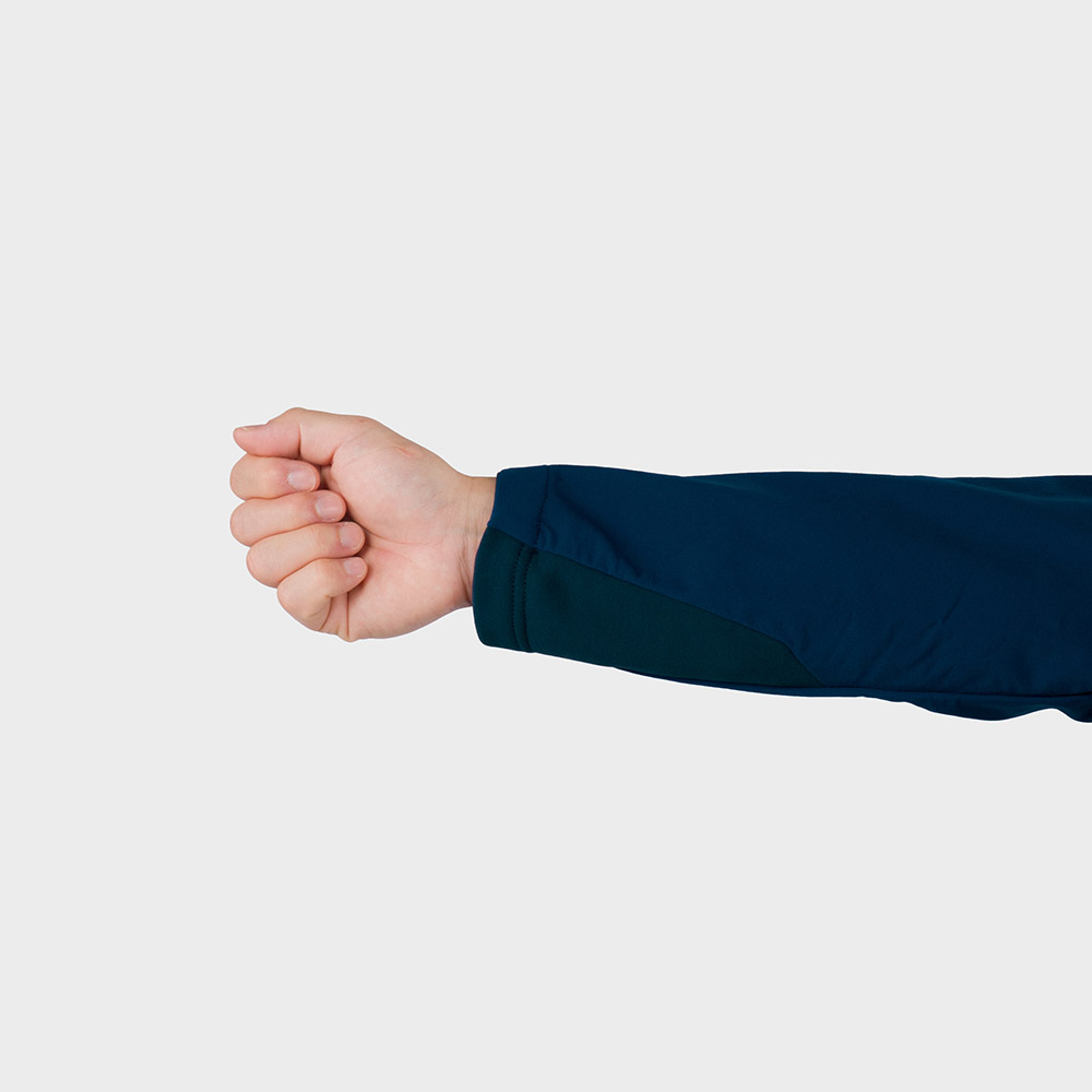 優れたストレッチ性を備えた生地の表裏に、異なる特長を持たせた素材です。表面には防風性とはっ水性に優れた素材、裏面には速乾性と保温性に優れた起毛地を使用し、高い汎用性を備えています。