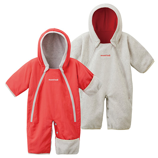 冬場にベビーカーでお出掛けする際などにおすすめのカバーオールです。柔らかく暖かなフリース素材にしなやかなナイロン地を付けて防風性を高めています。2本のフロントジッパーで簡単に脱ぎ着させることができ、股下のスナップボタンを全開すればおむつ替えも簡単。一着で2通りの色と風合いが楽しめるリバーシブル仕様です。