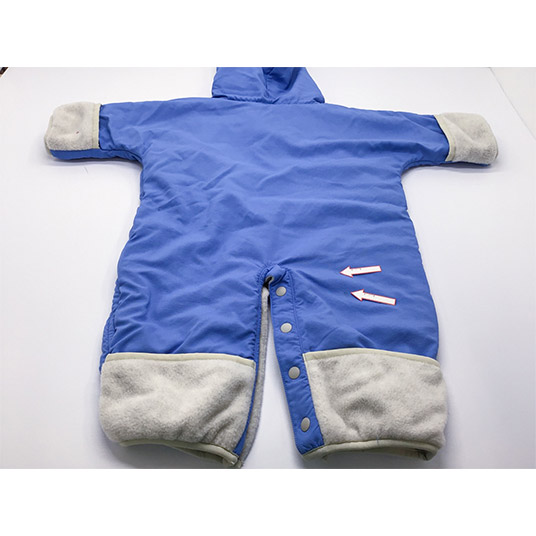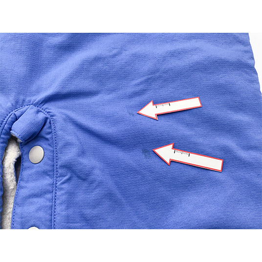 【特長】袖口と裾を折り返せば手足を覆える仕様/ジッパーがあごにあたらない仕様