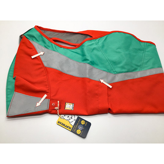 暗い場所や時間帯でも視認性を高める反射素材を備えたジャケットです。どの方向から光が当たっても目立つようになっています。はっ水性と耐摩耗性に優れた生地を使用しており、普段の散歩で活躍します。リーシュの通し口と、ビーコンを取り付けるためのループ付き。