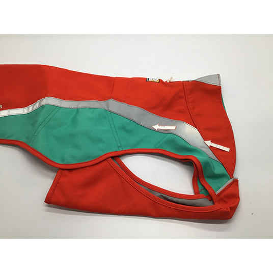 暗い場所や時間帯でも視認性を高める反射素材を備えたジャケットです。どの方向から光が当たっても目立つようになっています。はっ水性と耐摩耗性に優れた生地を使用しており、普段の散歩で活躍します。リーシュの通し口と、ビーコンを取り付けるためのループ付き。