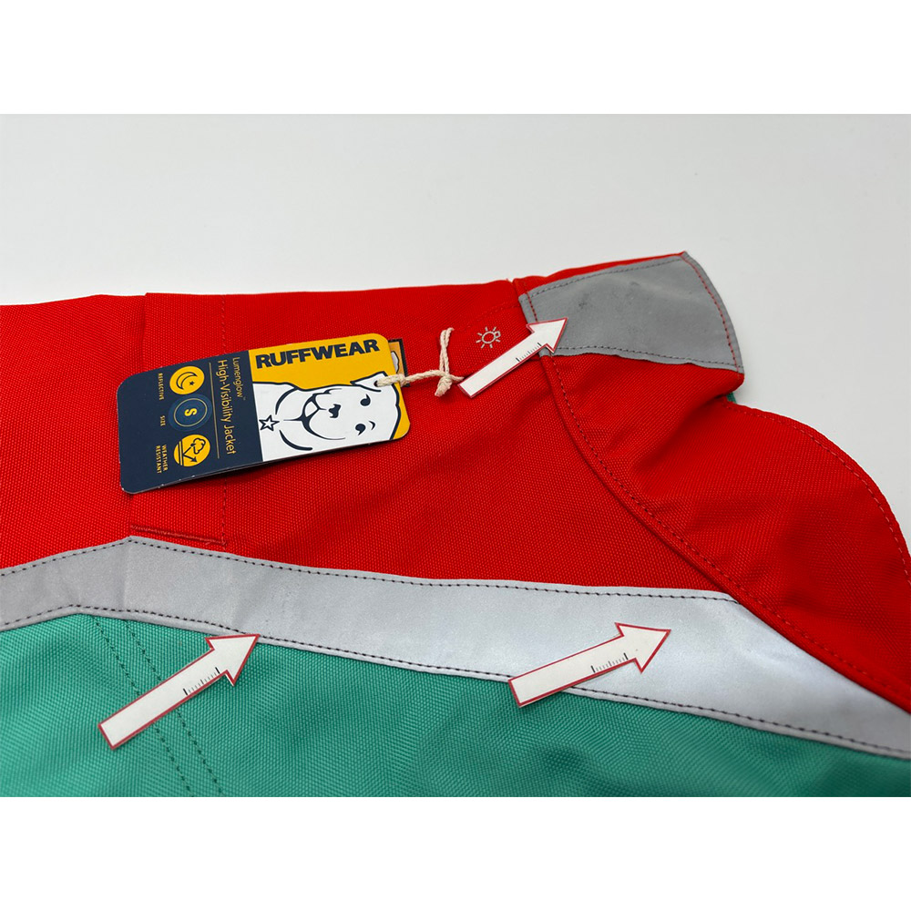 暗い場所や時間帯でも視認性を高める反射素材を備えたジャケットです。どの方向から光が当たっても目立つようになっています。はっ水性と耐摩耗性に優れた生地を使用しており、普段の散歩で活躍します。リーシュの通し口と、ビーコンを取り付けるためのループ付き。